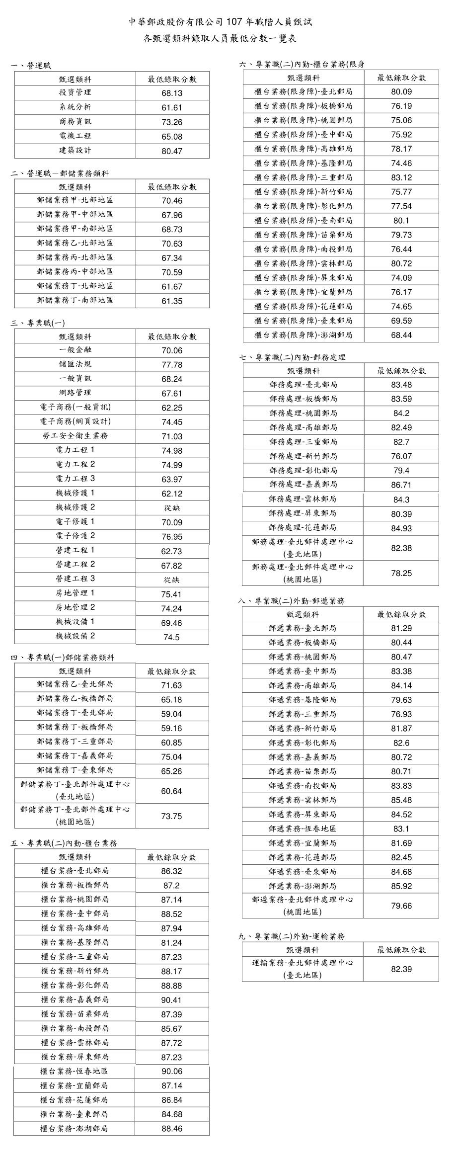 <考情報導>「107年中華郵政公司職階人員甄試」錄取分數統計表。