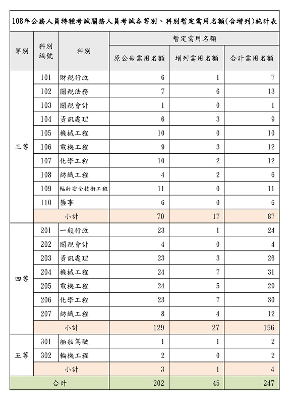一、為應用人機關業務需要,108年公務人員特種考試關務人員考試增列需用名額45名,108年公務人員特種考試身心障礙人員考試增列需用名額46名。二、本2項考試各等別、類科(科別)暫定需用名額(含增列)詳如統計表。