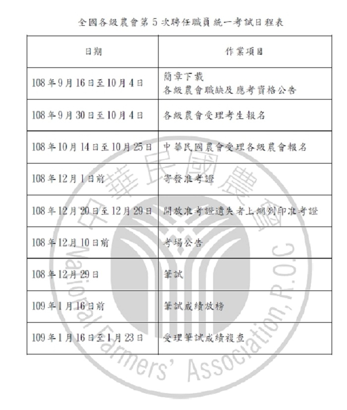 中華民國農會108.09.03公告「108年全國各級農會第5次聘任職員統一考試日程表」,如附件。