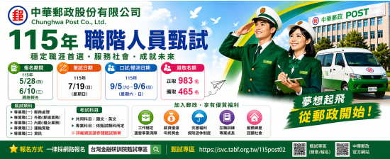 考試日期:115年7月19日年齡不限、高中職以上;分發中華郵政公司所屬單位工作,享國營事業待遇福利。